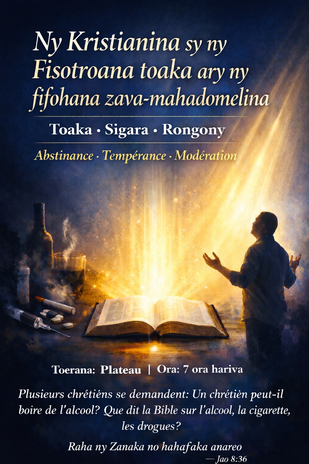Fahotana ve ny fisotroana, nefa Jesoa ary dia namadika ny rano ho tonga divay ? Ahoana ny mikasika ny abstinence sy ny tempérance ary ny modération ? Inona no tokony hataon’ny kristiana manoloana an’izany ? Noho izany dia azo hatao lohahevitra ny hoe : Inona ny ambaran’ny Baiboly mikasika ny zava-mahamamo sy ny zava-maha domelina.