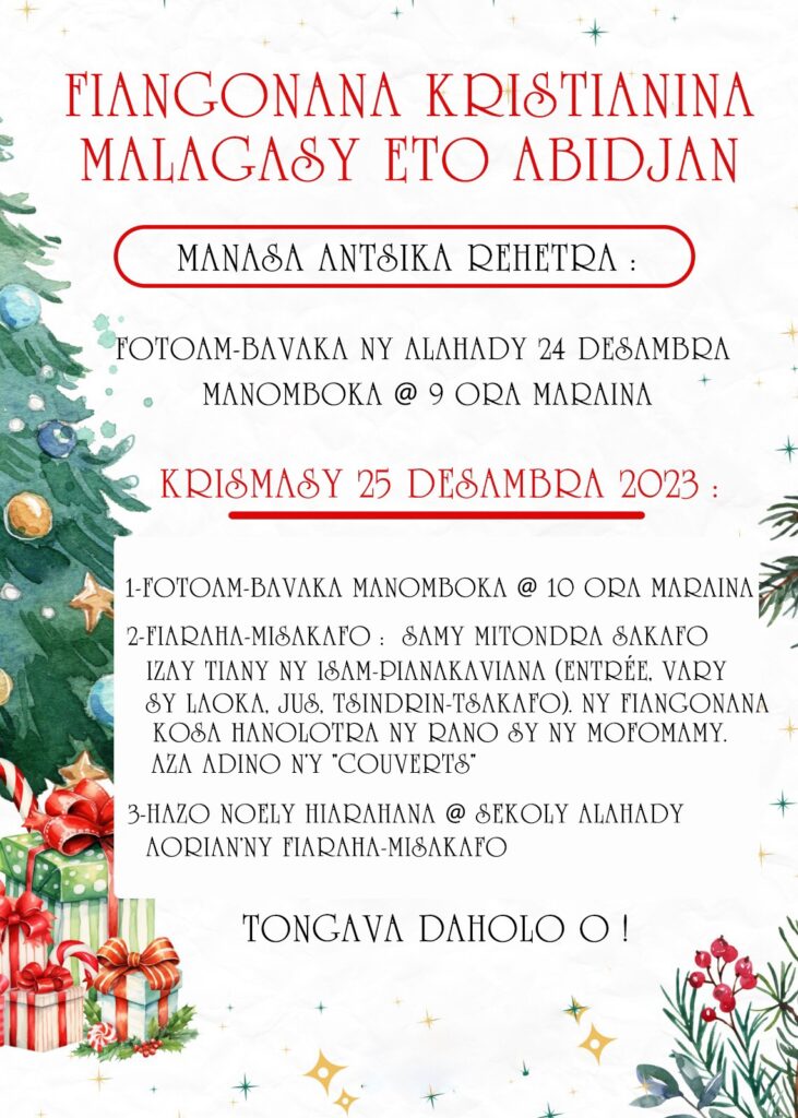 Fotoam-bavaka 24 sy 25 Desambra 2023par admindans Vaovaom-piangonanasur Publié le 20/12/202323/12/2023 Post Views: 9 Lahatsoratra sahala